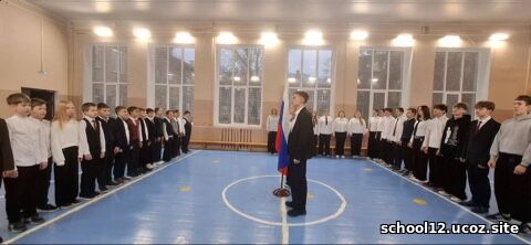 Поднятие флага и исполнение гимна. Впервые в церемонии принимали участие ученики 6Б класса под руководством своих наставников из 9А класса.